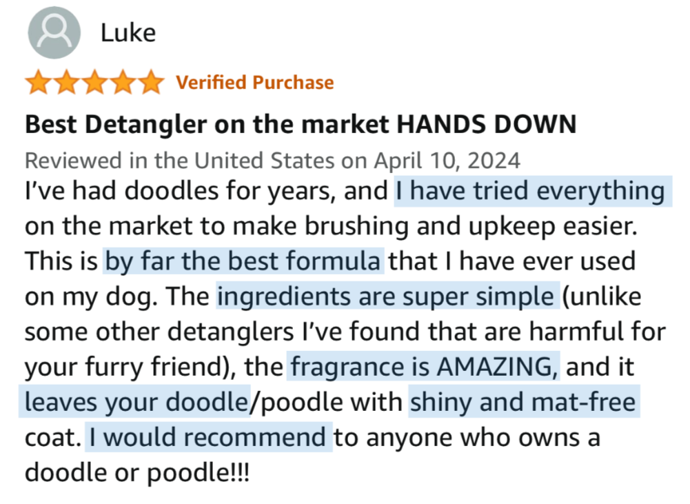 ✅ Effortless Grooming: Detangles tangles/mats from your Doodle's hair ensuring quick and easy grooming✅ Gentle for Sensitive Skin: Hypoallergenic and pH-balanced for dogs with sensitivities.✅ No Harsh Chemicals: All-natural ingredients. No paraben/SLS. No silicone.✅ Eco-Friendly & Ethical: Vegan, cruelty-free, environmentally considerate.✅ Made in the USA: Trusted American quality ensuring best care for your Doodle